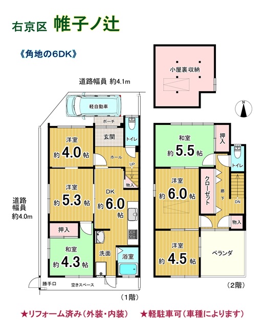 注目: 【 右京区 帷子ノ辻 大映通り商店街(南)の2階建住宅 】 ★令和7年10月:リフォーム済み(外装・内装) ★平成10年1月:リフォーム済み(増改築) ★角地の6DK ★軽自動車駐車可能(車種によります) ★フレスコにっさん太秦店まで約300m(徒歩4分)